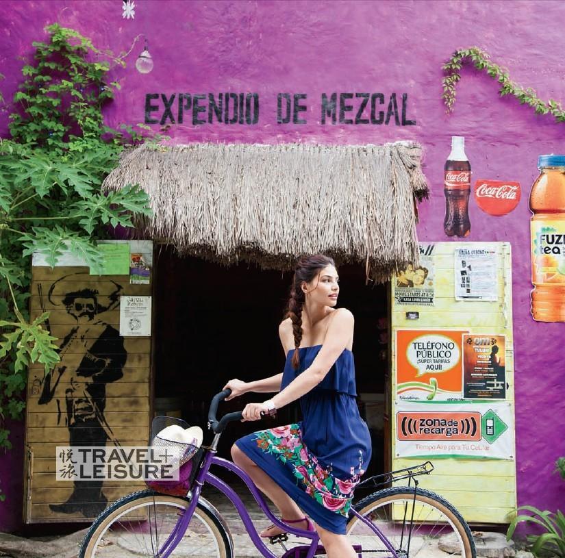沿着图卢姆主路骑行。模特服饰:DKNY连衣裙、Schutz女鞋、Cocobelle手镯和OndadeMar女帽(车兜里)。对页:...