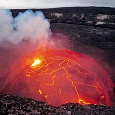 从空中俯瞰哈雷茂茂火山口(Halemaumau Caldera),可以看到炽热的岩浆从半凝固的地壳下奔腾而过,偶尔窜出...