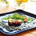 这道清新爽口的希腊沙拉,如果只是将食材简单拌在一起,那么便无法体现厨师的巧思了。将黄瓜切成小段并掏空内瓤,取而代之的是味道浓郁的菲达芝士,而上面点缀的“橄榄”,则运用了分子料理:将橄榄打成茸,加入迷迭香等香料,再用薄皮包裹住,自然形成一个外形如同橄榄的椭圆球,将其整颗置入口中,风味会在嘴里一下爆发出来。我们特地选用了最具小清新特质的酒品来与之搭配。Bodega Atamisque Serbal Viognier 2012 香气纯净,活跃的酸度与橄榄风味协调,更能将其的咸鲜风味激发出来。