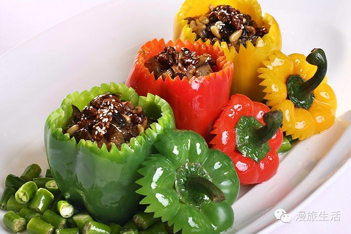 用宫保的烹饪方法将食材入味,装在彩椒里面,似红绿灯一般造型可爱、夺人眼球。牛肉粒厚实,味道浓郁,配上松子,更是香气馥郁。