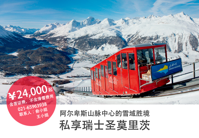 瑞士圣莫里茨,全世界王公贵族的聚集游览胜地, 全球高山滑雪的“麦加圣地”,瑞士最负盛名的高山温泉疗养胜地,她的优雅和高贵等您体验。 出行价格 冬季购物:24,000RMB/人 1月11日出发 圣诞特享:24,000RMB/人 12月14日出发 (不含滑雪费用) 详情咨询:021-6596 3938 联系人:俞小姐/王小姐 |